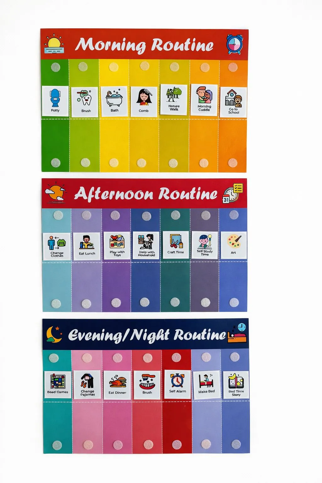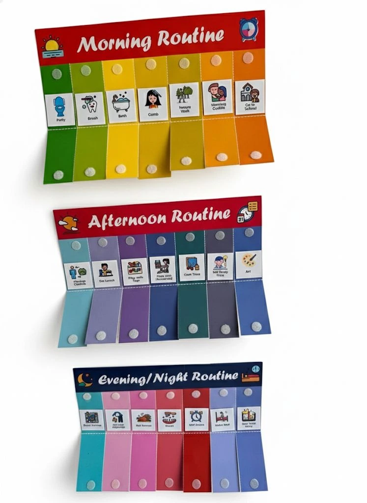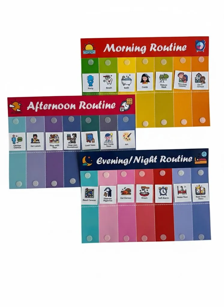 Daily Routine Chart for Kids Set of 3, Morning Afternoon and Night Routines, 20+ Velcro Stickers, Customisable and Detachable Habit-Building Charts