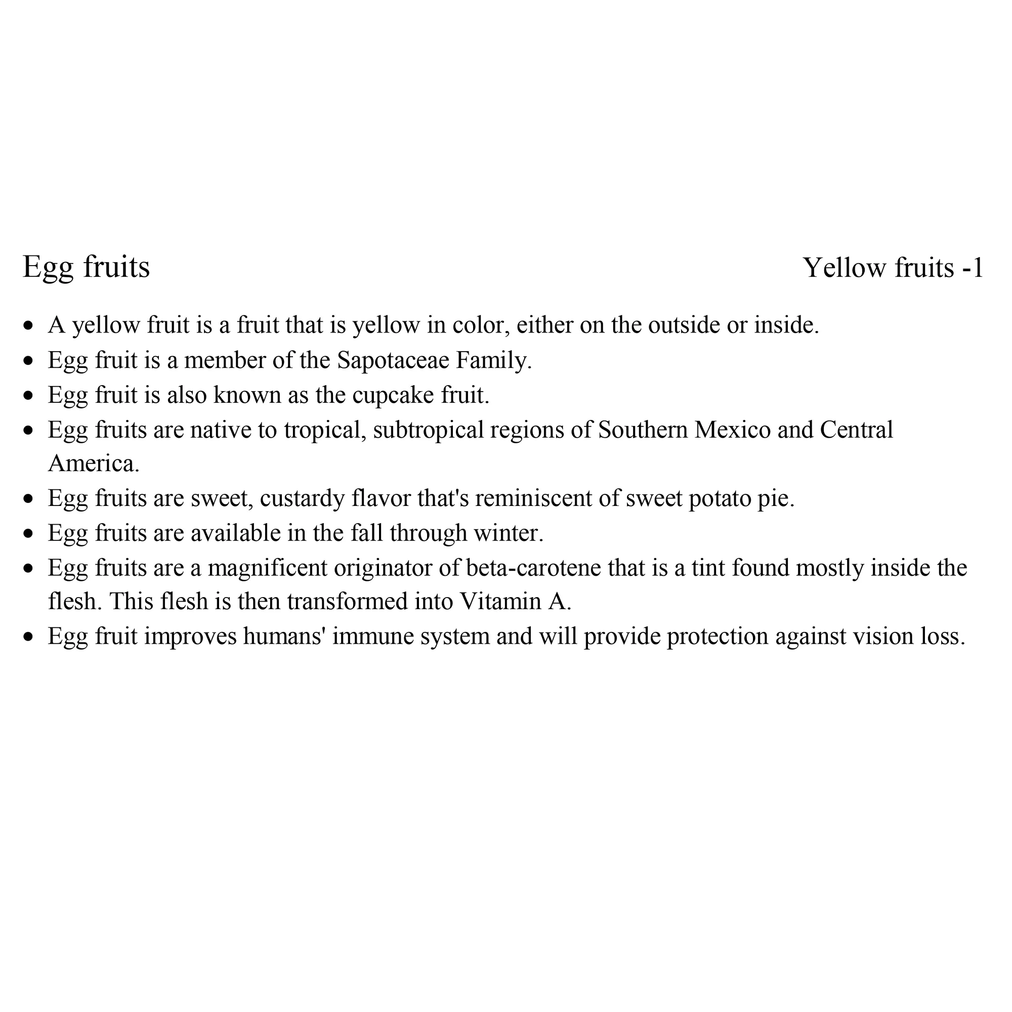 - Yellow Fruit – pineapple, papaya, quince and more — introduce bright, sunny fruits.