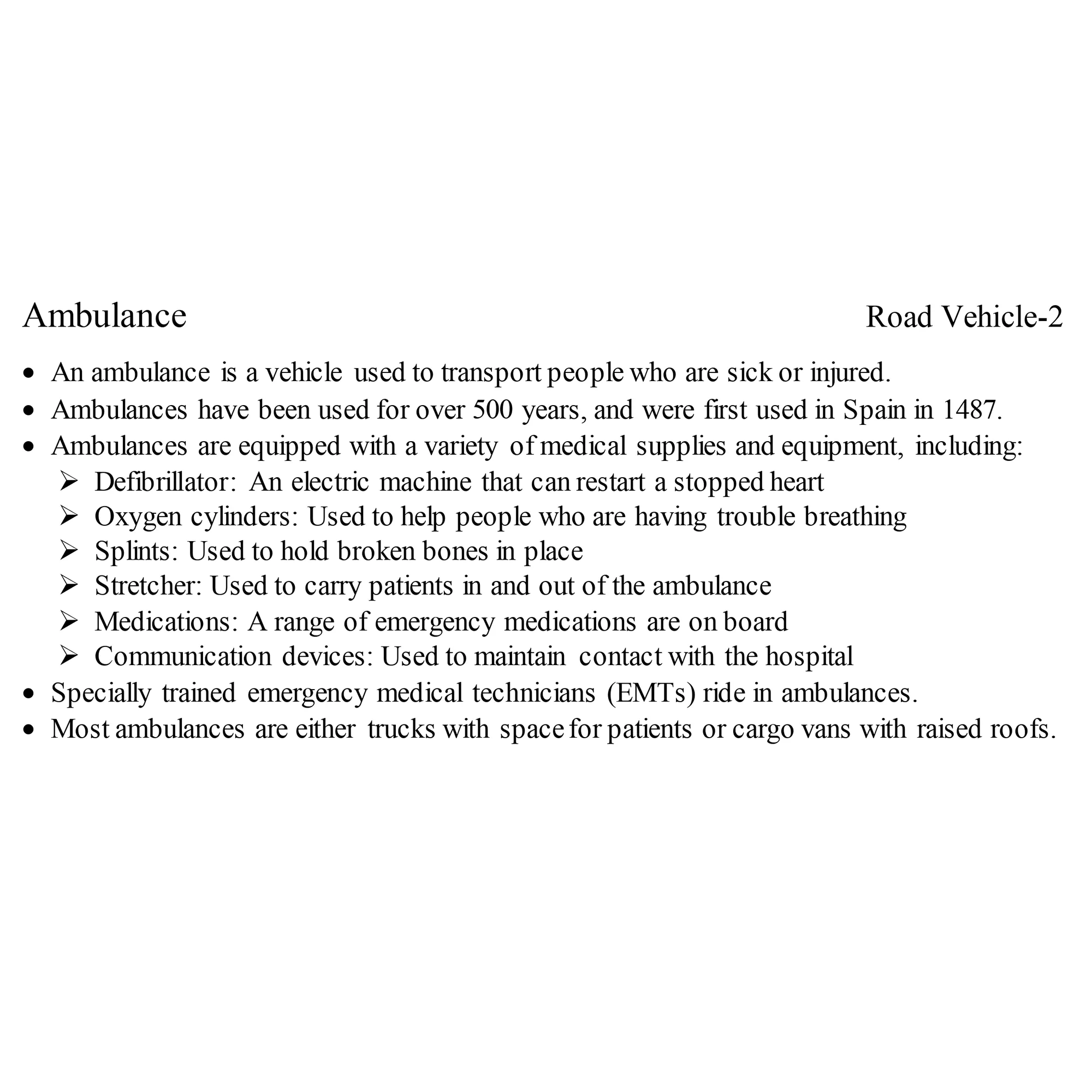 - Road Vehicles – auto, drum truck, ambulance and more — everyday vehicles children see on roads.