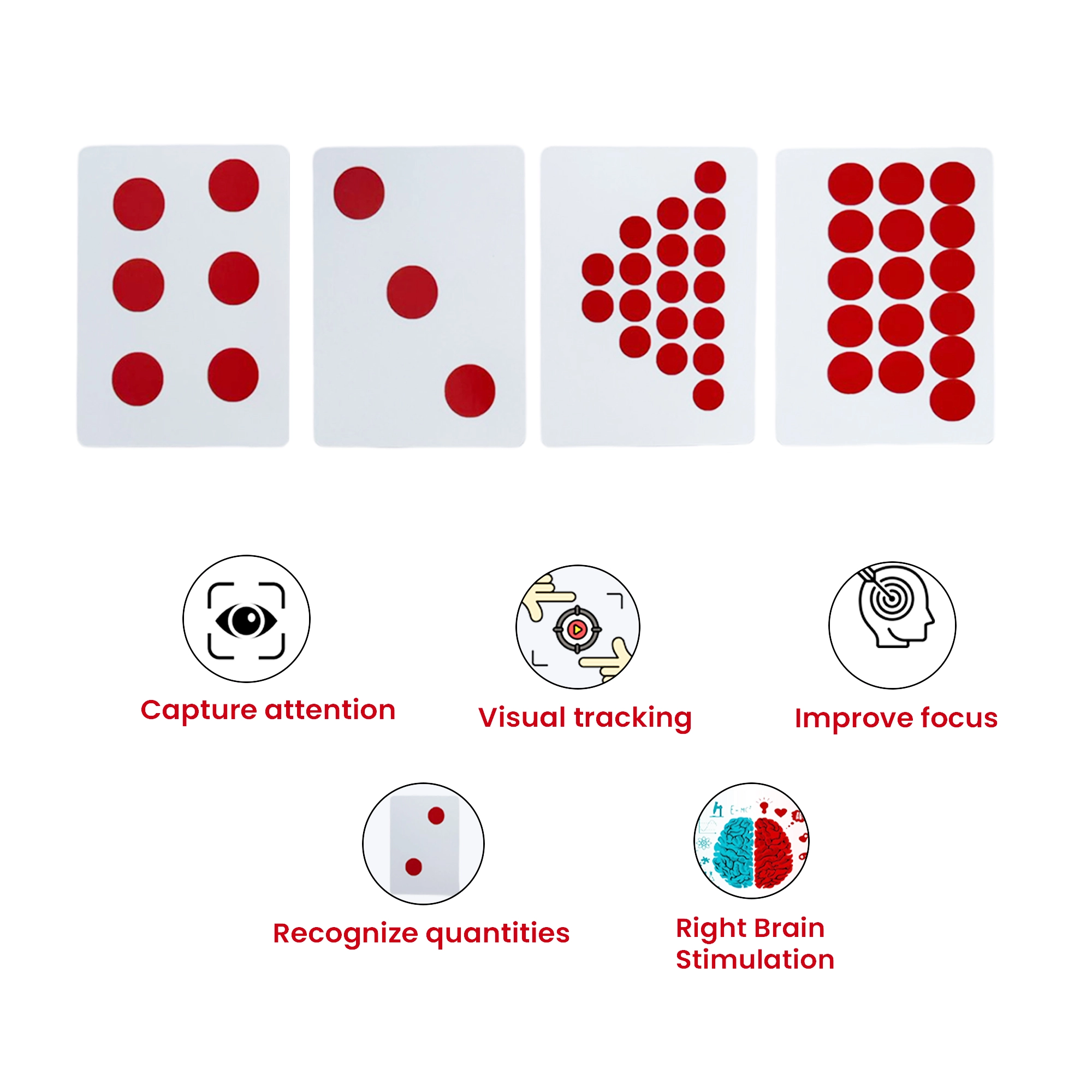 • High contrast red dots on a white background help capture attention and support early visual focus and tracking