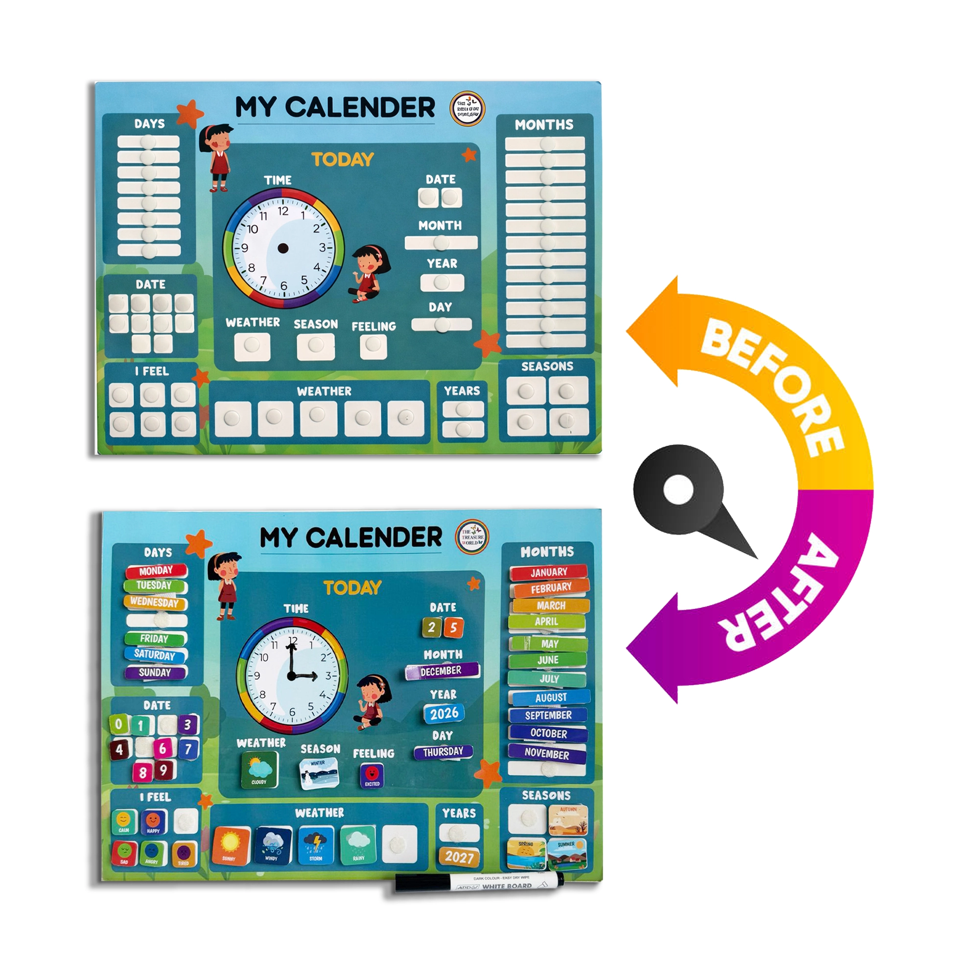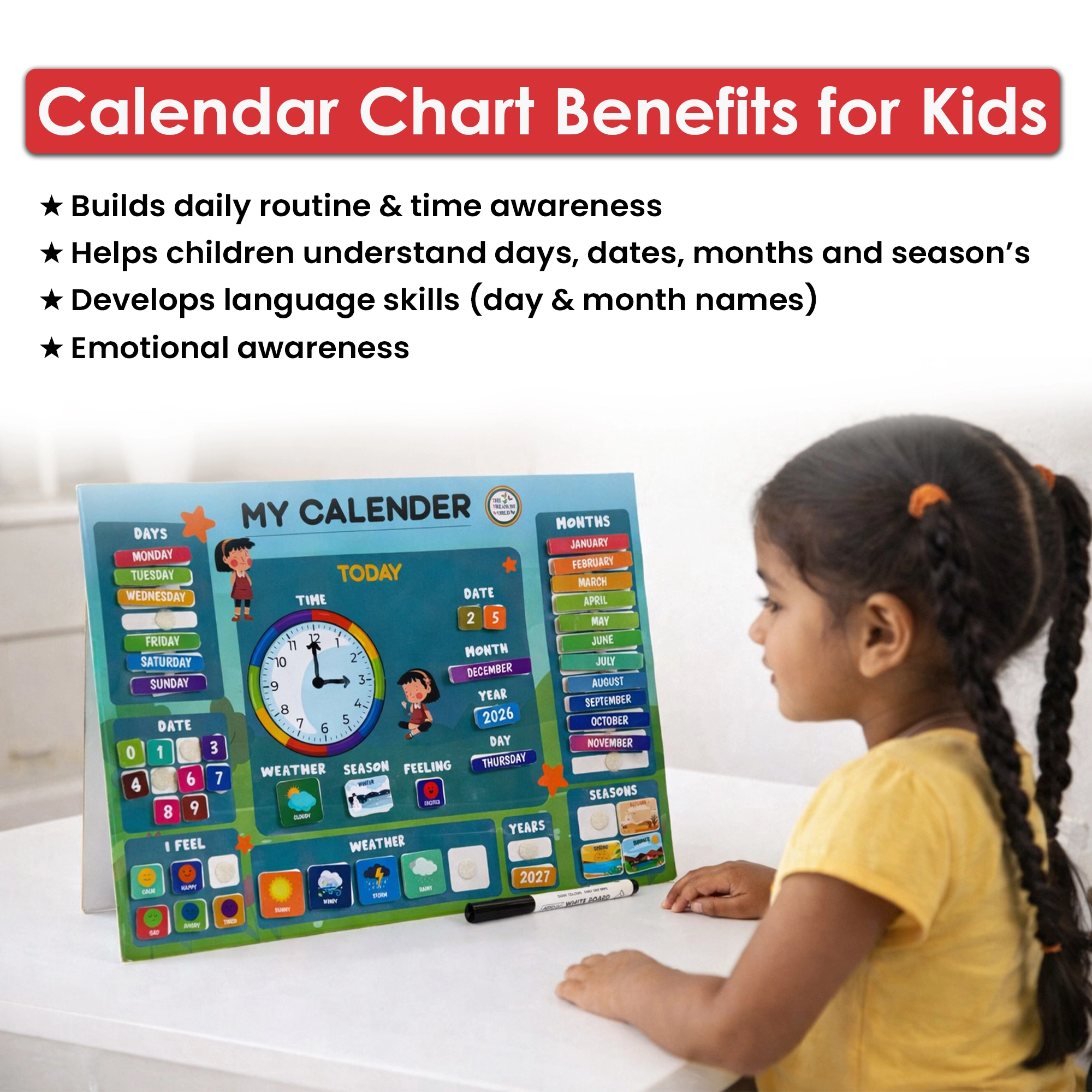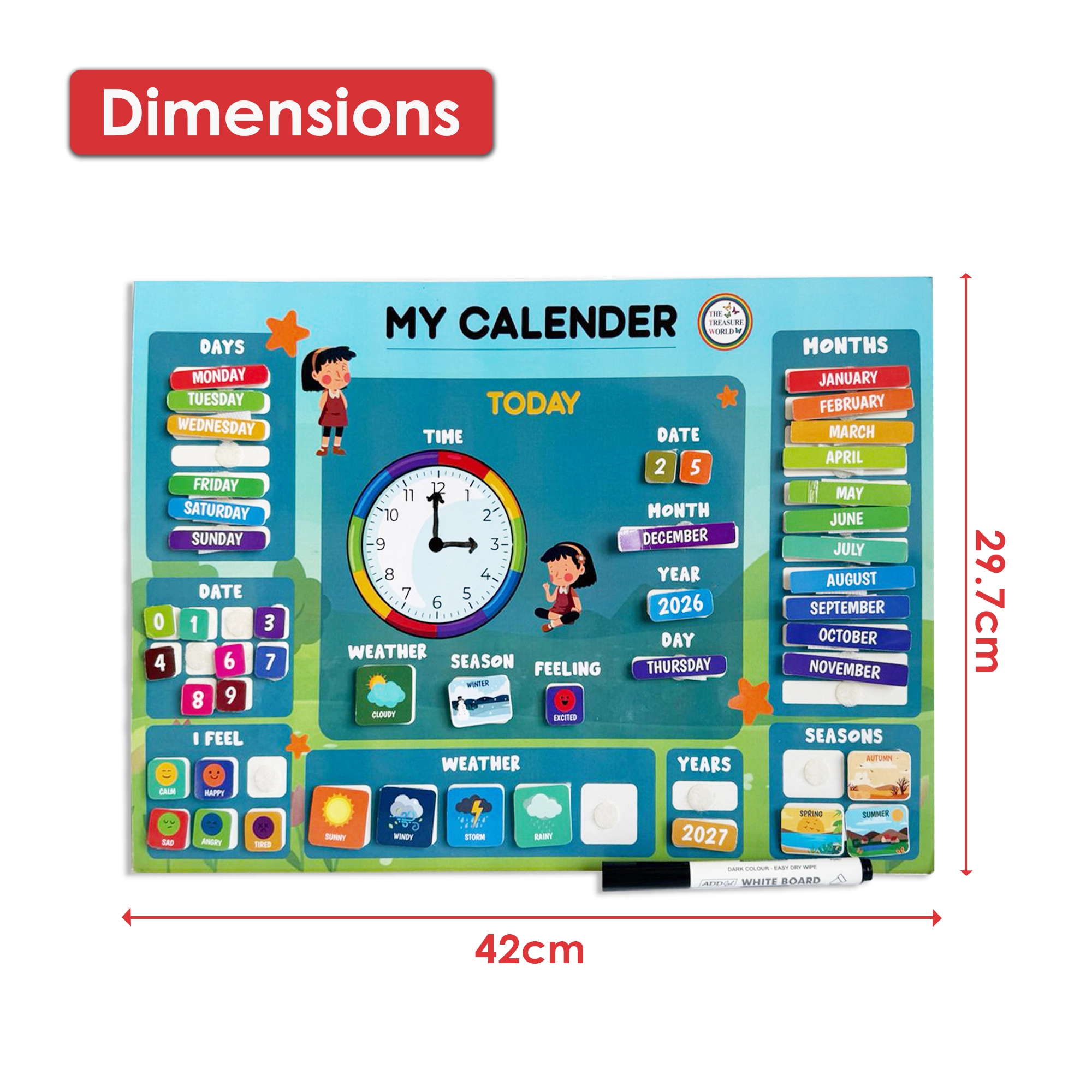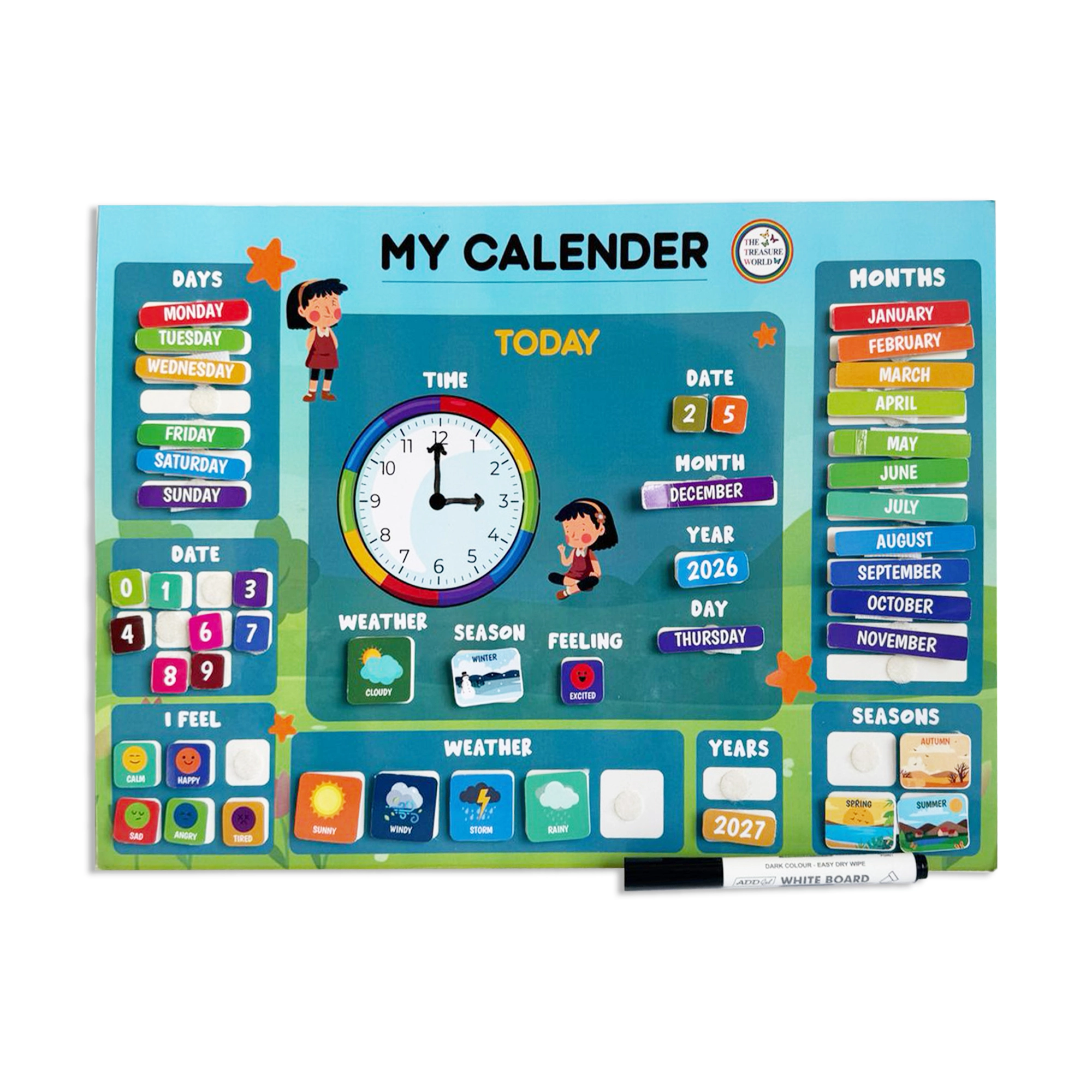 - Age-Appropriate Learning (3–8 Years): Designed to help young children understand time, dates, days, months, seasons, and daily routines in a simple and engaging way.