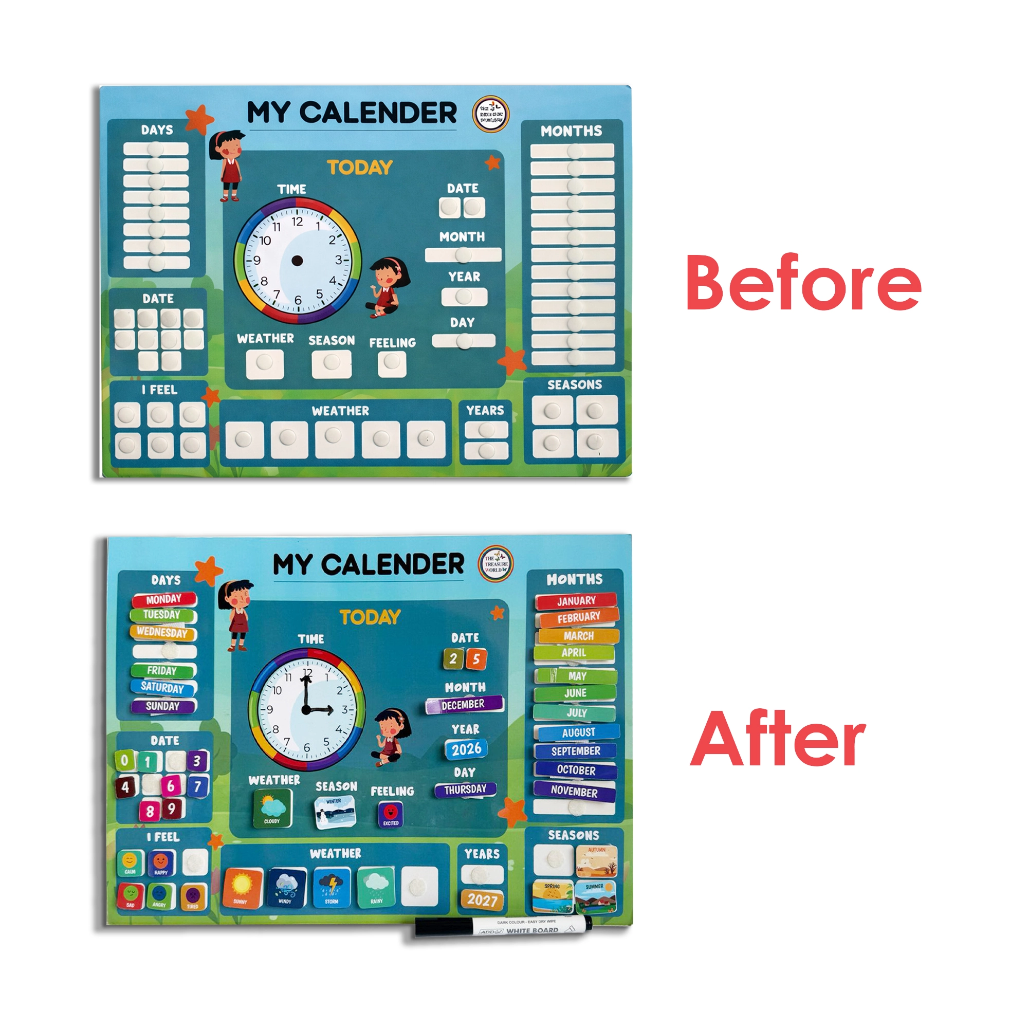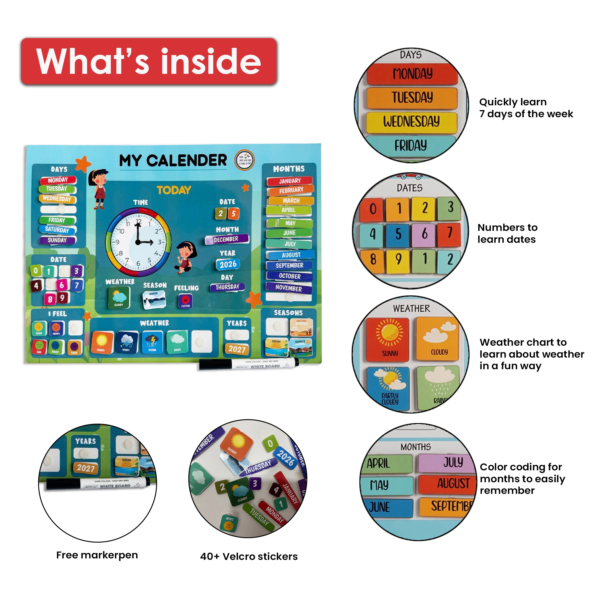 - 46 Reusable Velcro Stickers: Bright, easy-to-use Velcro pieces allow children to change days, dates, weather, and activities daily, encouraging hands-on learning and fine motor skills.